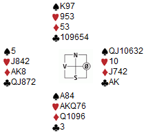 I et noe uryddig meldeforløpet klarte jeg og Frank i NS å klemme til med 7 ruter fra nord! Undeveis hadde jeg i syd vært inne med sparmelding, og når Borgar dobla sluttkontrakta var dette en klar beskjed til makker om at spar måtte ut. Trond Magne så ikke denne i øyeblikket og spilte hjerterkongen ut. Når sparkutten etterhvert gikk var makker lett hjemme med 13 stikk og 2330 (Vallset) inn på bok. En sjelden feil fra en nyslått stormester.
