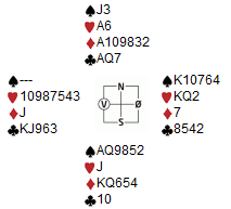 Jørgen Petter spilte liten hjerter ut, og denne stakk Odd Harald med kongen (!). Så vrir han tilbake liten hjerter, og stakkars Einar i vest tenker vel som de fleste andre av oss; dama sitter i nord og eneste sjansen er at syd også har hjerter-9. Dermed fisker han dypt med åtta, og resten av historia forstår dere. NS har sju stikk før Einar kommer inn.
