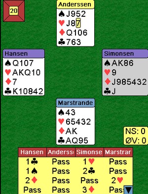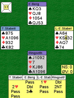 Veldig bra av Peter Marstrander. Han ble presset helt til 3kl, en kontrakt som ser helt død ut med sparesset, tre rutertapere og en hjertertaper. Følg med.
