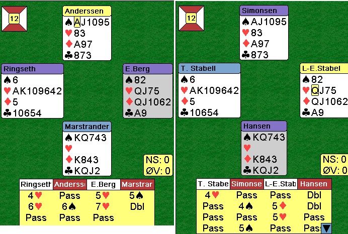 Steffen Fredrik SImonsen på det andre bordet visste ikke om makkers renons i hjerter og stoppa i 5sp. ØV trodde de skulle bli belønnet for å holde motparten vekk fra en iskald slem, men det både stemte og ikke stemte siden stampen i 7hj var så billig,