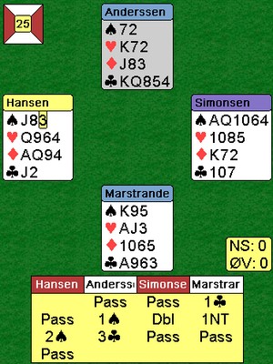 Først et apropos til meldingene. Kunstige meldinger er vel og bra, men det gir motparten muligheter til å komme med der et naturlig meldingsforløp holder dem ute. 1kl - 2kl og det går pass rundt. Nå kunne øst doble 1sp (1sp viser IKKE spar) og dermed være med til 2sp.