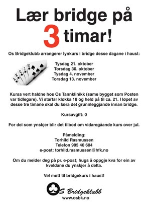 Her er oversikt over datoar det blir lynkurs i haust. Skriv ut PDF-en og heng opp!