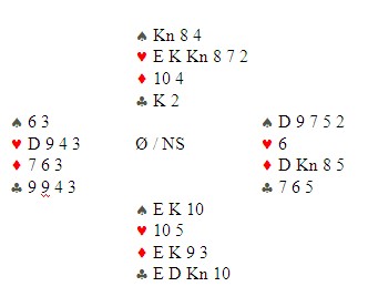 Kløver ut til kongen, hjerter til Ess, hjem på ruter, hjerter 10. Om den dekkes  eller ei spiller ingen rolle. Nå må vi spille ruter honnør og ruter til trumf, kløver til esset og kløver til trumf, spar til finesse (den må gå) og en spar honnør som vest må følge på. Nå kommer stående kløver. stjeler vest er det over, gjør han ikke er pinen utsatt til tolvte  stikk der D9 sakses opp av Vests KJ. Det ser så greit ut, men det må times riktig.
