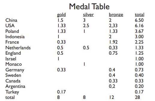 (0,17 gull betyr at Tyrkia har hatt en spiller, 1/6, på et vinnende lag. De andre desimalene er beregnet på samme måte)