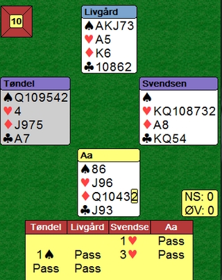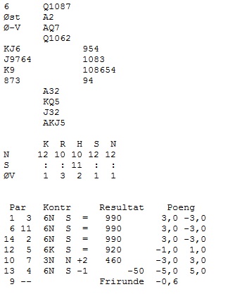 Bra forløp også dette selv om NS forstyrret mer. Spar ut til liten, 9-er og ess ble etter hvert fulgt av kløver til kapp og da N bare hadde singeltom i spar ble det er spennende sputtspill men hjemgang.