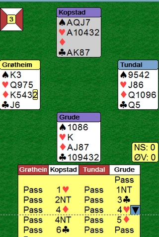 Så er det Ole Kopstad og Tor Eivind Grude som melder en fin kløverslem. Denne gangen sto det tretten stikk, men 6kl er akkurat passe etter min mening. Enten kløveren 2-2, sparkapp eller f.eks DJx i hjerter.