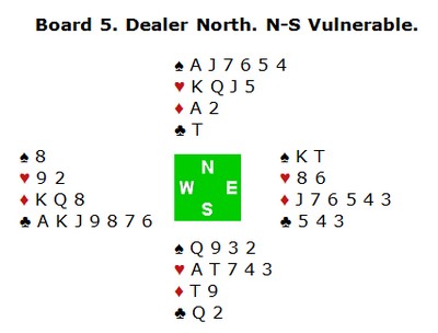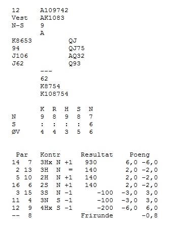 Lars Arthur kjente ikke meldingsforløpet, men nord hadde i alle fall åpnet med 1sp, syd hadde støttet og vest meldt kløver. Over 4sp stampa vest i 5kl og pressa nord til 5sp.