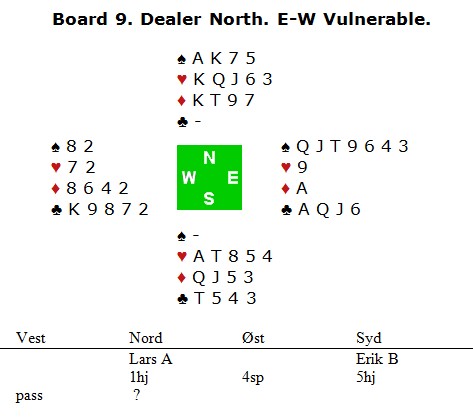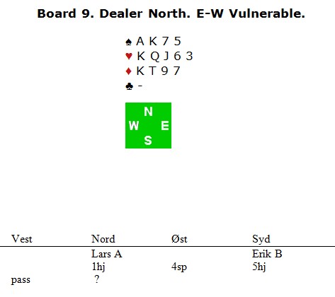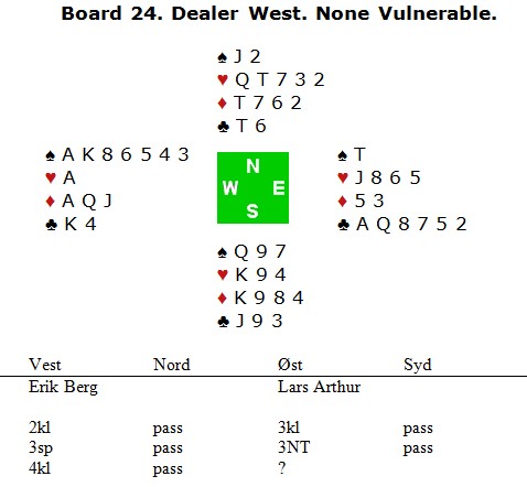 Lars Arthur var tøff i det forrige spillet der han meldte 6hj, mens her var han veldig forsiktig og løfta til 5kl i mangel av røde cuebid. 4NT er kanskje Blackwood, kanskje ikke? I ettertid sier han at et "fake-cuebid" av 4ru er best.