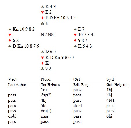 Så dobler Lars Arthur 6ru for å si at han er renons i hjerter og ballen går tilbake til Geir. Geir ser for seg dette motspillet: Hjerter ut til stjeling, kløver gjennom makkers konge og enda en hjerterstjeling pluss kløverdamen. Tre dobla sonebeiter i en frivillig slem!