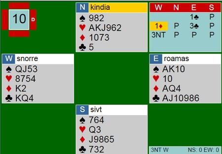 Jeg meldte 3NT i full fart uten å ta meg de nødvendige sekundene. Dette gjør vi alle og som regel blir vi ikke straffet. I slike spill skal vi oftest stoppe i 3NT, men det haster ikke å undersøke. 1ru benekter femkort major (Hauge-systemet). Jeg burde startet med 3ru for å vise hold der, så fortsetter makker med 3sp (hold i spar, men ikke i hjerter). Da kommer vi alle fall i 5kl, kanskje vi finner slemmen også. Det er for dumt å gå to sonebeiter i 3NT når det er 12 toppstikk i kløver.