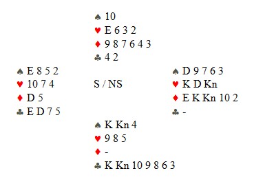 B: Vest stikker opp med esset og forsetter med kløver esset og mer kløver. Syd vinner lavt hjemme og tar for kongen. Nå er stillingen: