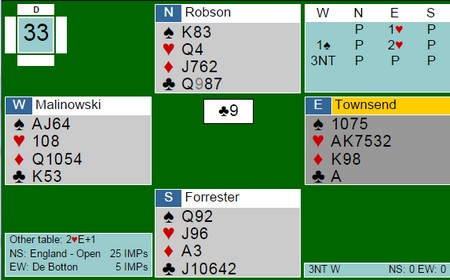 Men så til spillet til Arild. Nord har vært inne med hjertermelding, men Arild i Vest skulle spille hjem 3 Spar med disse korta: