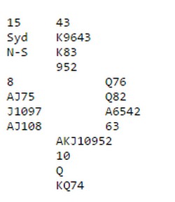 Hege Sundland skulle spille 6sp etter at øst hadde hoppa inn med 2NT for å vise begge minor. Ruter ut og nå så det trist ut. Hege fant den eneste planen som kunne lykkes, nemlig at sparen satt 5-0!  Derfor dro hun tre ganger hjerter og kasta ruteren sin. Nå var det hele tegnet og det var bare å passe på ikke å bli for kort i trumf. Det gikk selvsagt greit. Glimrende spilt!!