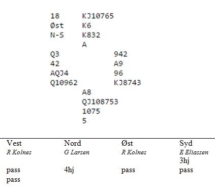 Jeg startet med ruterdamen som "selvsagt" sto. Jeg kunne ikke se enda hvem som hadde dobbel ruter, men jeg visste makker hadde spar esset eller hjerteresset. Skift til spar i tilfelle spillefører måtte gjette den fargen. Knekten vant, men på hjerter fra bordet gikk Ronny Kollnes opp på esset, spilte ruter til mitt ess og ruter til stjeling.