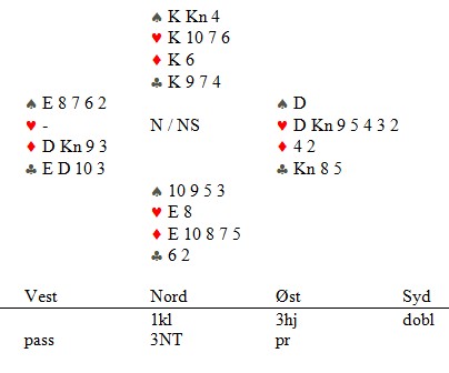 Spar knekt som fikk vinne stikket, men neste vant vest og spilte en liten kløver til øst sin åtter. Kløver knekt stakk vest med esset og godspilte fargen med damen. (Han burde kanskje latt knekten vinne)
