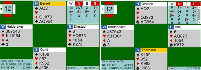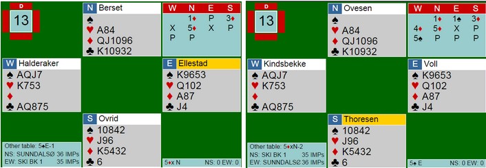 Her er to spill hvor Ski "vant" duellen på 5-trinnet. Halderaker - Ellestad stamper i 5hj, men ser du på kortene så er ikke elleve stikk til å hindre. +650. På det andre bordet er Kindsbekken - Violl også i 5hjx, men Siv Thoresen klarer å ta ut i 6ru. Nå burde kanskje Voll - Kindsbekken spilt slik at en dobling i 4.hånd av mopartens slem viser akkurat et stikk. (med to stikk passer han og stamper med ingen stikk fordi makker har ikke to. Da hadde han dobla i andre hånd). Roar Voll bør kunne regne med at kløverkongen gir stikk, og da hadde Asbjørn Kindsbekken passa lett med trumfesset. Ingen stor sving, så kanskje en grei forsikring av ØV?