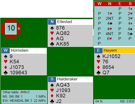 Det er lett å bli etterpåklok når en skal skrive om spill. Dette spillet er kanskje et slikt, men det viser i alle fall at kommunikasjonen mellom Olav Ellestad og Bjørnar Halderaker er på plass. Det kan se litt underlig ut av syd å gå på over 4hj med en minimumsåpning, men poenget er at den er allerede vis med 3hj. Selv da var makker sleminteressert og Bjørnar vurderte sine mellomkort i trumf til å være viktige, det samme med ED i spar og ruterkongen. Det stemte og kontrakten var rett så fin. Det stod i praksis på en av to finesser, og når begge gikk var det tretten stikk. 11 IMP i gevinst mot 4hj +510 på det andre bordet.
