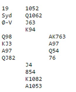 ØV kom til 4sp etter kløveråpning i vest og Lars Arthur i nord spilte ut hjerter. Ikke noen spesielt heldig start. Så spar til bordet og kløver til dame og konge. To sekunder og ruterknekten (!) lå på bordet. Hva som er rett spilleplan nå, er umulig å si. Har nord Kn108 i ruter, skal knekten få beholde stikket og fargen kan ikke spilles mer av NS. Har syd tieren (eller evt åtteren) skal knekten dekkkes med damen.