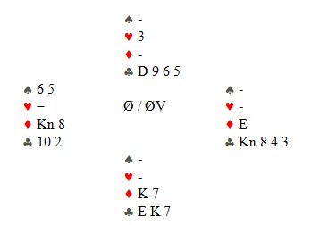 Jeg spiller ut hjerter 10 som går til øst sin konge, og det fortsettes med en hjerter til dame og ess. En kløver går til dama i bordet og spar knekt slippes rundt til dama. Kløver konge stikkes av esset, fulgt av ny spar til esset og nok en sparrunde til min konge. Jeg frir meg med en kløver som spillefører trumfer og spiller en ruter mot konge-knekt i bordet.