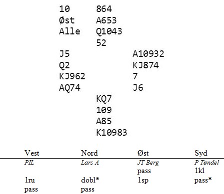 Jeg ser du skryter av Lars Arthur, og der må jeg bare henge meg på. En mer behagelig og velspillende makker skal en lete lenge etter! Her er et eksempel fra helga (Kamp 2, første halvrunde, spill 10). Det var bare snakk om et overstikk i en delkontrakt, men det forringer ikke poenget med å hjelpe makker.