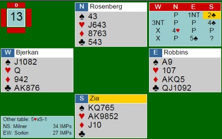 Dette spillet er fra USA og jeg lar meg imponere over spillere som klarer å finne den riktige meldingen, selv om det bridgeteoretisk ser helt vitl ut. Øst tar ut makkers straffedobling (?) fordi det høres ut som syd vet hva han holder på med. 4hj steinstår, akkurat det samme som 5kl.