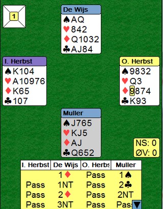 Fra den pågående treningskampen mellom Israel og Nederland. Øst spilte ut ruter 9 til knekt og konge. (1ru --> 2+). Hvis nieren kan være fra D98xx, så skjønner jeg at vest fortsatte fargen. Jeg spiller hjerter tilbake fordi jeg vet at spillefører har ruterfargen.