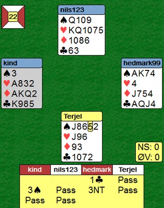 Jeg griner. Hvorfor kan dere ikke melde de fargene dere har? En og en. Nedenfra og opp. Hvis dere finner tilpass, støtter dere hverandre. Ja, jeg vet det er umoderne og bakstreversk, men det virker. Å komme til storeslem i minor er kanskje mye å forvente, men 6kl/6ru må da være mulig for topparene våre?
