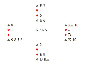Nå skal du få ei motspillsprøve fra tirsdagen. Motparten har meldt seg opp i sparkontrakt, og makker spiller hjerter-7 ut. Bordets (vest) og din (nord) beholdning i hjerter ser slik ut: