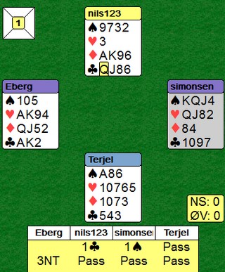 Legg merke til den tynne åpninga til Nils. Kun 10hp, men mottakelig i tre farger. Førstemann på banen. Steffen melder inn på firekortfarge, men omtrent samme argumentet som Nils. "Vi må tidlig inn i meldingsforløpet": Erik Berg er en praktiker og melder det som står, nemlig 3NT.