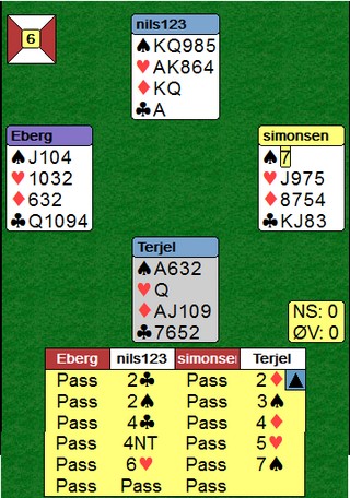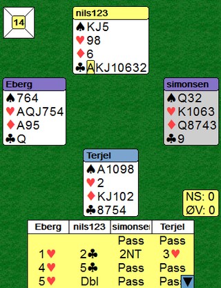 Nils passer over 5kl med EK i en farge og makker har åpnet, uten at jeg helt skjønner hvorfor . Han ble reddet av gong-gongen.