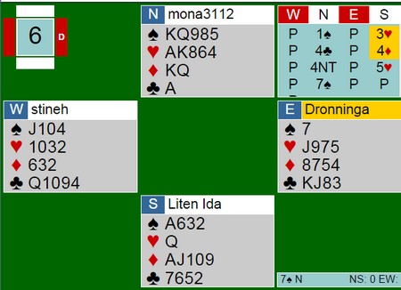 Jeg kan ikke annet enn å undre meg over at toppar som Welland - Auken har lagt nesten all tidligere logikk for hvordan en melder i bridge bak seg. De åpner med 1kl selv med femkort major og etterpå er det nesten bare kunstige meldinger. MAnge har sikkert lest mine artikler om at mange åpner for ofte i en intetsigende 1kl i stedet for å begynne tidlig med å finne farger å kunne bruke som trumf. Derfor GRØSSER jeg over både slike åpninger og slike meldingsforløp. Å finne 4-4 tilpass i major er noe av det jeg mener er aller viktigst i bridge, men der er tydeligvis ikke alle enige. 2hj ville gått greit hjem NS med minst åtte stikk. En helt unødvendig bunn for NS, men all ære til ØV som takker og bukker.