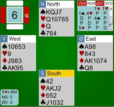 Det er mulig at dette er etterpåklokskap å kritisere nord for doblingen av 4sp, men Pernille Lindaas i vest gjorde en glimrende beslutning når hun tok ut 4spD i 5ru. Nord trodde julekvelden var kommet i 4sp. Det var den på en måte også, men når fruen fra Arendal tok ut i 5ru var kvelden over for NS. En litt forsiktig spilleføring og Jørn Arild fikk stjålet to hjertere i bordet og kastet en spar på EK i kløver. +750 og masse norske IMP!