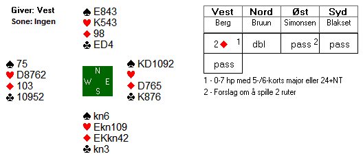 Erik Berg åpnet i første hånd, ingen i sonen, med søppelmulti 2 ruter. Dette viser 0-7 hp med en majorfarge eller en oversterk balansert hånd med minst 24 hp. Utenfor sonen kan farga være på bare 5 kort. Steffen Fredrik Simonsen måtte ta stilling til hva han skulle melde med følgende hånd etter at hans høyre motstander doblet multiåpninga.