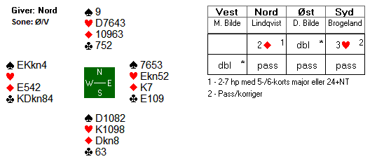 Over Espens førstehåndsmulti doblet Dennis Bilde opplysende. Boye hadde 4-4 i majorfargene og såpass begrensede verdier at hånda hans var ideell å sperre med. Det så ut som det måtte stå minst utgang hos motparten i sonen. Dermed hoppet han til 3 hjerter som ber Espen passe med hjerter eller ta ut om han har spar. Morten Bilde, som er faren til Dennis, doblet for å vise at han hadde kort og samtidig var usikker på hva som skulle bli endestasjonen. Dennis valgte å passe ned med Ekn52 i hjerter.