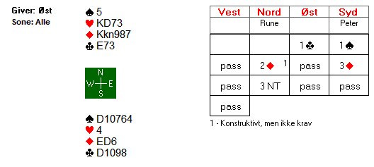 Fortsettelsen var kløver dame som vest dekket med kongen og Rune vant med esset. Da han så spilte ny kløver gikk øst i tenkeboksen. Til slutt valgte han å vinne stikket med knekten.
