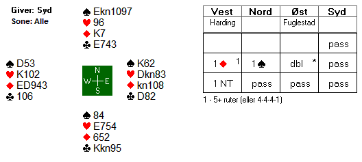 Den norske spilleren som hadde disse kortene sperret friskt med 3 kløver over en 1 ruteråpning. Motstanderen bak doblet (negativ dobling, "takeout"), og åpneren sa 3 grand.