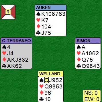 Meldingsforløpet var fort gjort, 1 kløver fra nord og 4 spar fra syd. Vest spilte ut ruter 3. Hva ville du gjort nå? Kontrakten er bombesikker, syv sparstikk, ess-konge i hjerter og ruter ess. Det er gode muligheter for elleve stikk også. Men ruterutspillet kan på en helsvart dag være farlig. Hvis du slipper den første ruteren og øst har femkort vinner han det stikket, gir makkeren en ruterstjeling, kommer inn igjen i kløver og kan gi vest enda en ruterstjeling. En bet før spillefører kommer inn! Det er ikke alltid det å gi opp overstikkene er riktig selv i lagkamp, men her er det vel greit å vinne med ruter ess og ta de ti sikre stikkene. Færeøyenes syd slapp ruteren. Skrekkscenarioet jeg skisserte skjedde ikke, men øst spilte kløver til vest og det kom nok en ruter. Nå sviktet motet, og han gikk opp med esset og vant ti stikk. Det satt snilt, ruterhonnørene fordelt og fargen 3-3, så ingen fare. Men slik det ble spilt,han gikk opp med ruter ess andre gangen, kunne det blitt gått bet om utspillet var fra femkorts ruter.