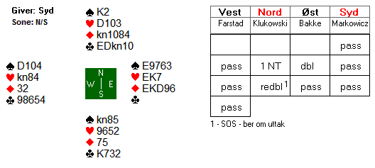I lukket rom åpnet Geir Helgemo med 1 ruter (ikke krav, men sjeldent å få pass rundt?), Fredrik Steffen Sinonsen gikk innpå med 1 spar og Tor Helness doblet negativt (=4+ hjerter). Erik Berg i Syd sperremeldte 4 spar, men Geir var ikke til å stoppe, 5 spar var Exclution Blackwood (Hjerter avtalt trumf, spør etter ess utenom spar), dobling fra Nord (= farge- styrke?) og redobling fra Øst (Ropi= 0 ess!) og deretter fikk Helgemo tilslag i 6 hjerter. Han vet jo at hj K mangler. Nord- Syd kunne stampet men Berg anså kanskje at det kunne bli bet? Lilleslemmen sto, men taper i hjerter kunne ikke unngås.