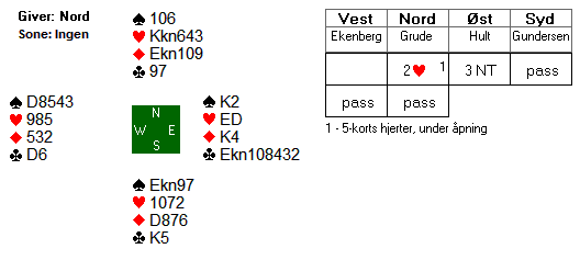 Med åpne kort står kontrakten selv uten ruter ut fordi øst blir skvist i spar og ruter. Hun må gå ned på singel spar konge for å holde ruteren gardert. I praksis spiller man vel heller på finessen i spar og går beit.