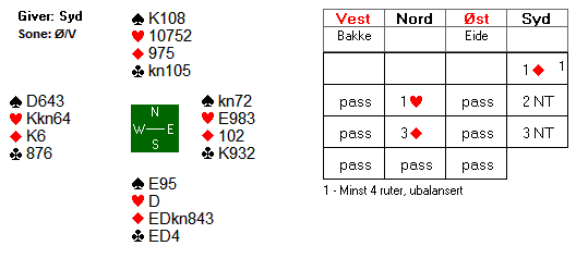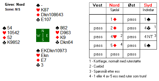 "Grunnen til at jeg meldte 4kl og satte ruter som trumf var fordi jeg var interessert i å vite om Sofie hadde ruter kongen når jeg spurte i 4NT i tilfelle det sto 7sp."