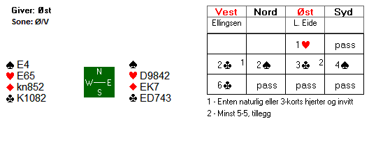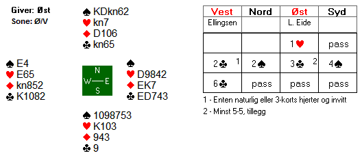Du har ikke inntak til bordet utenom ruteren og risikerer å få bare to stikk i farga på denne måten. Men det er etter alt å dømme nok. Teller du fem hjerterstikk og kløverstikket vi allerede har fått er vi oppe i åtte. Motparten må gi deg et svart stikk til og du kan notere vunnet kontrakt.