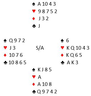 Syd var inne og han hadde avgitt kun ett stikk. Han spilte ruter 8 og trumfet med spar ess, så en ikke stående hjerter som han kastet en godspilt kløver på! I det stikket måtte vest trumfe bare for å være nødt til å avslutte fra Q-7 i trumf rett inn i syds K-J. Elleve stikk, ett redoblet overstikk, og det gir den uvanlige scoren +1480.