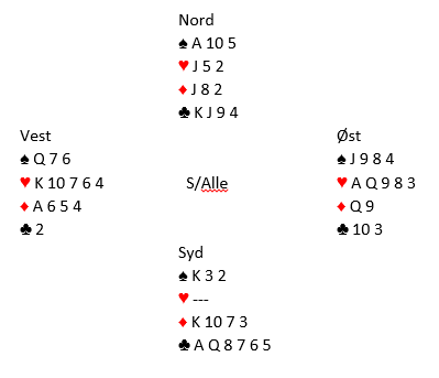 Da jeg ble fortalt om dette spillet fikk jeg det som et spørsmål: Ser du noen mulighet for å få kun elleve stikk i 3 kløver selv om spillefører ikke gjør noe dumt? Ved første øyekast ser det ut som det ganske enkelt står lilleslem i kløver (eller for å si det på en annen måte, det er tolv stikk i kløverkontrakt) fordi ruteren sitter så veldig snilt. Det blir kun en rutertaper, og det er sterke nok mellomkort til at fargen gir tre stikk siden øst har Q-9 dobbel. Syds fjerde ruter gir avkast for en spar hos nord, og syds tredje spar kan trumfes hos nord.