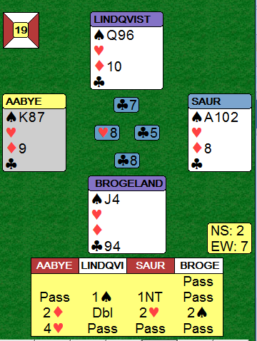 Nord måtte på dette tidspunktet holde tre spar og dermed kun en ruter. Saur fridde seg med ruter og nord ble innspilt. Hvis han spiller liten spar fra D-9-x rulles fargen opp pga. vests K-8-x kombinert med E-10-x hos øst. Lindqvist så dette og spilte spar dame i diagramsituasjonen - godt motspill! Da måtte Saur gjette, og nord kunne vel godt ha hatt D-kn i spar fra start i stedet for bare D-9?. Saur vant med kongen og tok deretter ikke unaturlig finessen med spar 10, men den røk til Brogelands knekt. Syd vant det siste stikket for kløver 9 - to bet! Egentlig bra spilt av Saur, men pga. feilvalget til slutt ble det 13 IMP til Rogaland.