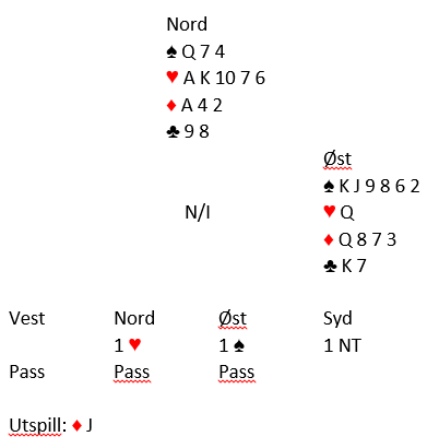 Du har talt opp 17 honørpoeng, sterk åpning det, men så åpner Syd foran deg med 1 spar. Selv bruker dere naturlige metoder, dobling vil vise ca 12 + Hp og love 4+ hjerter eller en 16+ Hp hånd med god egen 5+ farge. Innmelding med farge (uten hopp) lover 10+ Hp og god 5+ farge, hopp i ny farge er sperr, men ikke noe av dette passer jo godt. 1 NT viser 15-17 Hp med hold i spar og grand fordeling men der er to dobbeltoner ikke «etter boka». Jan P. Johannesen valgte en annen løsning, hopp til 2 NT, uvanlig NT som viser de to laveste umeldte fargene, altså minor. Avtalen var 5-5 men ikke sterk og 2 NT ble alertert. Nord passet, Tor Martinsen svarte 3 ruter, det er bare vanlig minor- preferanse, men styrken kan jo være svak. Syd meldte videre med budet 3 hjerter. Hva nå, bør Vest være utmeldt?
