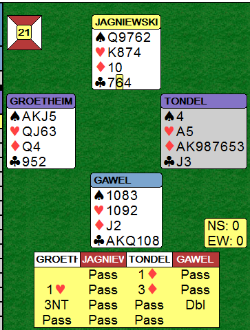 Kl 10 ut stakk Øst med esset og fortsatte med sp 10 som jeg lot løpe.Kl J dukket jeg også og Øst spilte så hj 8, jeg prøvde knekten men Vest vant med damen. Alt var håpløst, og verre ble det da Vest tok for sp K og kl K og spilte kløver til Øst sitt ess. Hj 7 til 9 og 10 fortsatte marerittet, men nå var i hvert fall motparten innspilt. Ru D gikk til min konge, jeg forsøkte meg med hj 2 men Vest fikk to stikk og måtte gi meg nok ett i ruter til slutt. -5, altså -1400 i score, kan ØV vinne 6 NT? Tankene gikkvidere et par tre timer, for 1440 ville jo vært større tap, men ingen fasit ga seg. Godt å våkne og innse at dette bare var en vond drøm.