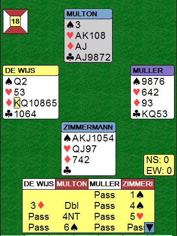 Vil du kravåpne i Øst eller nøyer du deg med 1 spar og tenker i neste runde å hoppe i hjerter? Flere fikk pass på 1 spar, Vest har bare 3 hp. Som man ser er det lett i vinne 4 hjerter med 12 stikk når kl K er i Syd. Bare ett par kom altså i 6 hjerter.