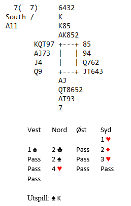 Her er det en soleklar feil i antagelsen om spillets forløp. Inne på spar ess i første stikk vil selvsagt spillefører starte med A-K i kløver og kaste spar knekt. Så ville vel de fleste ha spilt trumfkongen. Da ser det ut til å kunne bli kun to hjertertapere og en rutertaper, men det blir nok bet med beste motspill. Spillefører må innom hjerter to ganger, og hver gang blir han trumfkortet med spar fra vest. Idet han skal sette opp ruterfargen sin vil han i så fall være uten trumf, og øst får til slutt både ett stikk i ruter og ett i kløver.
