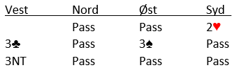Du er altså i 3 grand som vest og får hjerter 5 ut fra nord. Det virker naturlig å lasjere hjerteren, og kanskje ligge unna de to første i tilfelle hjerteren sitter 5-3 som langt i fra er umulig etter åpning 2 hjerter i disse soneforholdene. Hvis du gjør det vinner syd de to første hjerterstikkene og spiller (aktuelt) kløver, selv om kanskje spar 10 i skift ville vært bedre motspill. Vest legger kløver knekt og nord følger med liten, godt motspill da det gjør det problematisk med overgang til hånden (vest). Da spillet forekom fulgte ruter til knekten og kløver til damen og kongen. Dette var igjen: