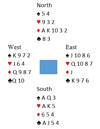 Vi kan glemme alle 3-2 sitsene, da får du fire ruterstikk uansett om du ikke starter med A-K. Så her gjelder det å se på 4-1 sitsene. Det er en 4-1 sits hvor som er mulig å løse, men hvor det går galt om du spiller esset først, og det er Q-J fjerde foran. Vest legger korrekt liten idet du spiller liten til esset. Om du så spiller deg over til syd og spiller mot K-10-x-x legger vest liten nok en gang. Du kan vinne det stikket med tieren, men vest har fortsatt stopper og du får bare tre ruterstikk. Om det sitter slik er liten til tieren løsningen i fargens første runde. Idet tieren vinner stikk (om det sitter sånn) spilles elegant liten fra begge hender, og du får fire de ruterstikkene som behøves. Men som beskrevet, liten til tieren i første runde av fargen går galt om det sitter som i vårt diagram. Så hvordan skal man kunne bestemme hvilken 4-1 sits man skal forsøke å sikre seg mot?